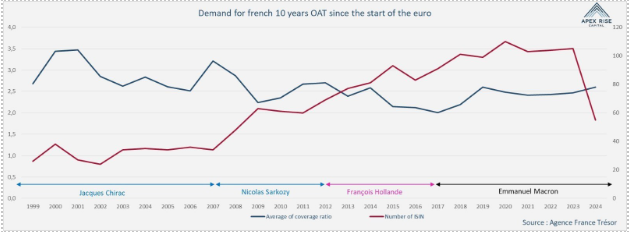 La France utilise le marché monétaire pour ses besoins de financement depuis plus de 20 ans et a réussi à maintenir un ratio de couverture largement stable pour ses enchères récurrentes d'OAT. La demande de financement de la France est restée à des niveaux raisonnables malgré les changements entre les principaux partis au fil des années. Cependant, il existe des préoccupations qu'un passage à une position politique extrême puisse changer la perception des investisseurs sur la France.