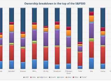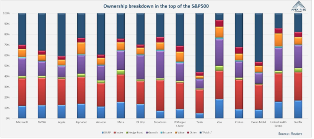 Une perspective intéressante sur la répartition de l'actionnariat pour certaines des plus grandes entreprises du monde. Visuellement, la plupart d'entre elles présentent une répartition similaire, à l'exception de Visa et Tesla. Ces deux entreprises représentent des extrêmes dans la catégorie des investisseurs "Public".